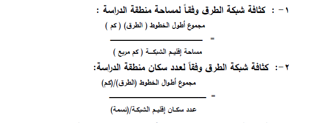 - قياس كثافة شبكات الطرق: ترتبط كثافة شبكات الطرق بعوامل عديدة منها المساحة التي تظم الشبكة أو عدد الشبكات ضمن إقليم الشبكة، وأن قياس كثافة الشبكات من القياسات العامة التي يستفاد منها لأغراض المقارنة مع مثيلاتها في أقاليم متعددة.