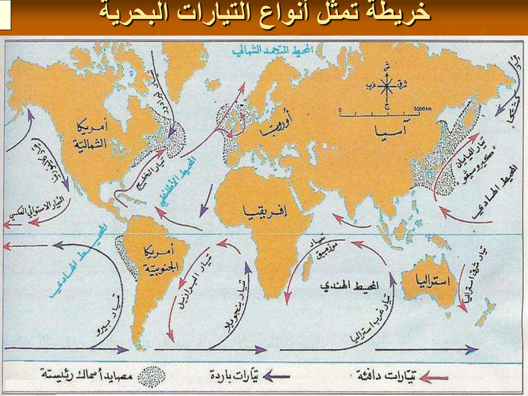 التيارات البحرية: هي كتلة من المياه تتحرك باتجاهات محددة لمسافات بعيدة على شكل ما يشبه أنهاراً مائية ضخمة في المحيطات والبحار، تتحرك المیاه بشكل طبقات مائیة تنحرف أو تحید عن اتجاهها بتأثير الحركة الدورانية للأرض (تأثير كوريوليس) سبب حدوث التيارات البحرية إلى اختلاف كثافة المياه و اختلاف درجة حرارة المياه و اختلاف نسبة الملوحة.