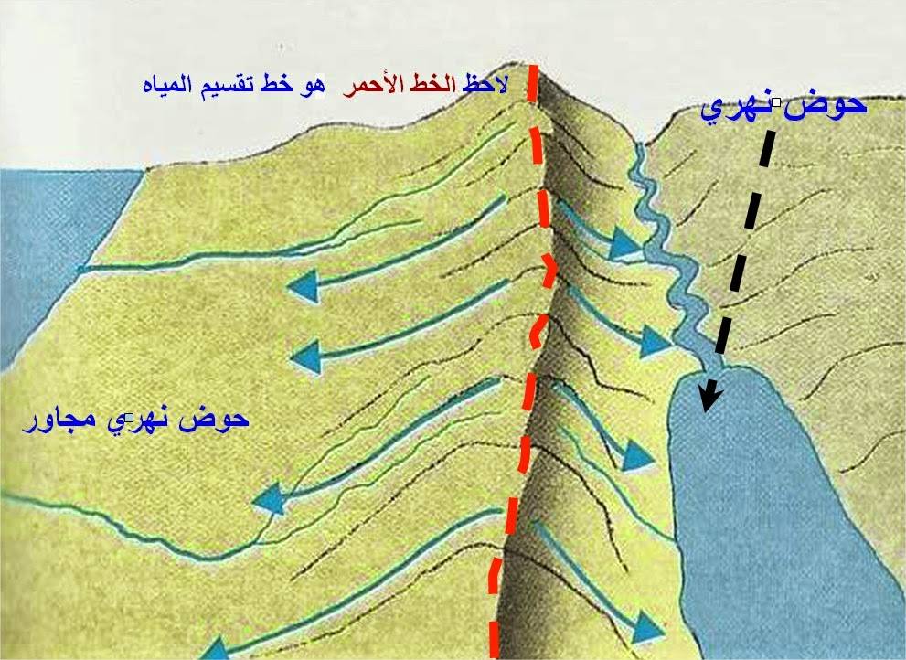 خط تقسم المياه : هو مرتفع يفصل بين حوضي تصرف لمجموعتين نهريتين.