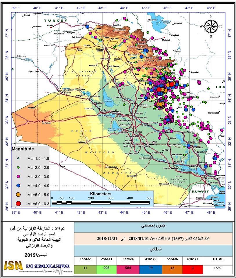 خارطة النشاط الزلزالي لسنة 2018 للعراق والمناطق المجاورة