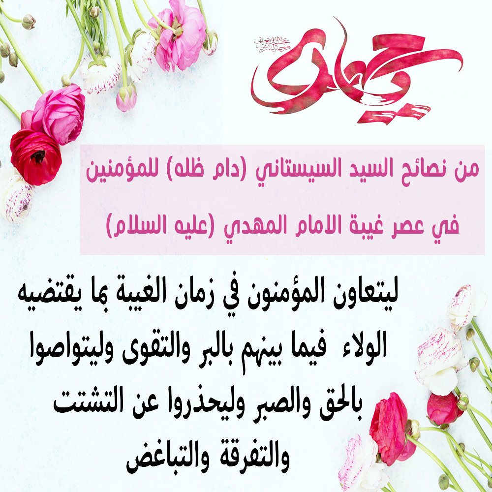 من نصائح سماحته (دام ظلّه) للمؤمنين في عصر غيبة الامام المهدي (عج) : ليتعاون المؤمنون في زمان الغيبة بما يقتضيه الولاء فيما بينهم بالبر والتقوى وليتواصوا بالحق والصبر وليحذروا عن التشتت والتفرقة والتباغض .