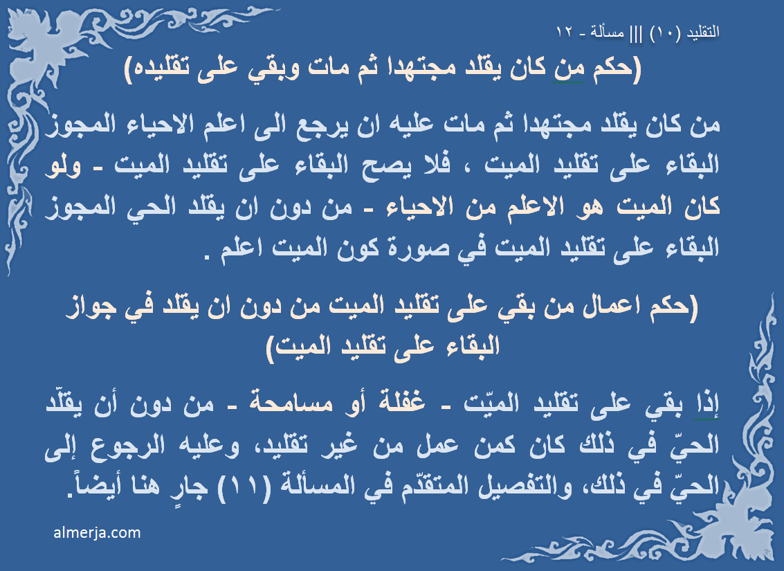 من كان يقلد مجتهدا ثم مات عليه ان يرجع الى اعلم الاحياء المجوز البقاء على تقليد الميت ، فلا يصح البقاء على تقليد الميت - ولو كان الميت هو الاعلم من الاحياء - من دون ان يقلد الحي المجوز البقاء على تقليد الميت في صورة كون الميت اعلم .