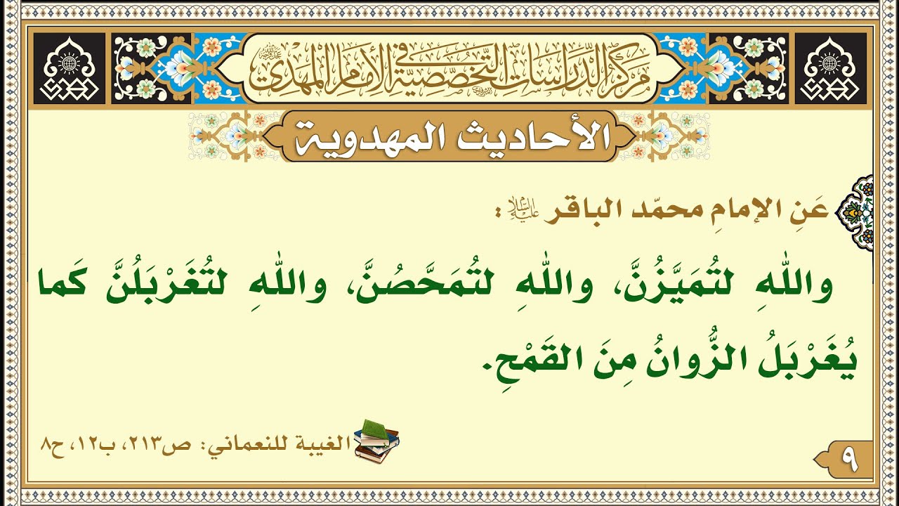 عن الإمام أبي جعفر محمد بن علي الباقر (عليه السلام) أنّه قال: "واللهِ لتُمَيَّزُنَّ، واللهِ لتُمَحَّصُنَّ، واللهِ لتُغَرْبَلُنَّ كَما يُغَرْبَلُ الزُّوانُ مِنَ القَمْحِ". (الغيبة للنعمانيّ). نسأل الله تعالى حسن العاقبة.
