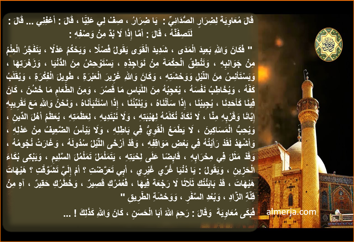 قَالَ مُعَاوِيَةُ لِضِرَارٍ الصُّدَائِيِّ : يَا ضِرَارُ , صِفْ لِي عَلِيًّا ، قَالَ : أَعْفِنِي ... قَالَ : لَتَصِفَنَّهُ ، قَالَ : أَمَّا إِذَا لَا بُدَّ مِنْ وَصْفِهِ :