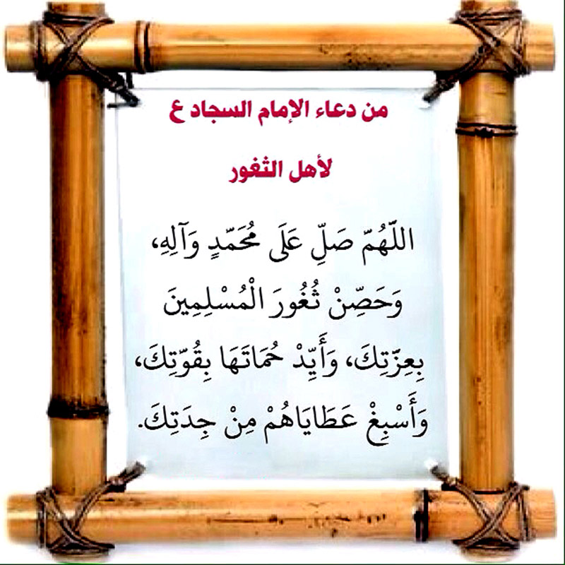 اَللَّهُمَّ صَلِّ عَلَى مُحَمَّدٍ وَآلِهِ، وحَصِّنْ ثُغُورَ الْمُسْلِمِينَ بِعِزَّتِكَ، وأَيِّدْ حُمَاتَهَا بِقُوَّتِكَ، وأَسْبِغْ عَطَايَاهُمْ مِنْ جِدَتِكَ. اَللَّهُمَّ صَلِّ عَلَى مُحَمَّدٍ وَآلِهِ، وكَثِّرْ عِدَّتَهُمْ، وَاشْحَذْ أَسْلِحَتَهُمْ، واحْرُسْ حَوْزَتَهُمْ، وامْنَعْ حَوْمَتَهُمْ، وَأَلِّفْ جَمْعَهُمْ، وَدَبِّرْ أَمْرَهُمْ، وَوَاتِرْ بَيْنَ مِيَرِهِمْ، وَتَوَحَّدْ بِكِفَايَةِ مُؤَنِهِمْ، وَاعْضُدْهُمْ بِالنَّصْرِ، وأَعِنْهُمْ بِالصَّبْرِ. وَالْطُفْ لَهُمْ فِي الْمَكْرِ.