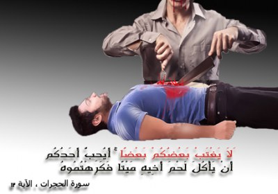 "إنّ حرمة الغيبة تعد من بديهيات الفقه، وهي من المعاصي الكبيرة والموبقات المهلكة. وإنّ لهذه الخطيئة الكبيرة في عالم الغيب وراء حجاب الملكوت، صورة قبيحة وبشعة تفضح الإنسان في الملأ الأعلى أمام الأنبياء والمرسلين والملائكة المقرّبين .. إنّ لأعمالنا صوراً وأشكالاً تناسبها ستظهر بتلك الصور والأشكال لتعود إلينا في العالم الآخر، والمغتاب يضاهي الكلاب الجارحة في افتراسه لأعراض الناس ولحومهم، وسيظهر بهذه الصورة كلب ينهش لحم ميّت في نار جهنم". * الغيبة من (الأربعون حديثاً).