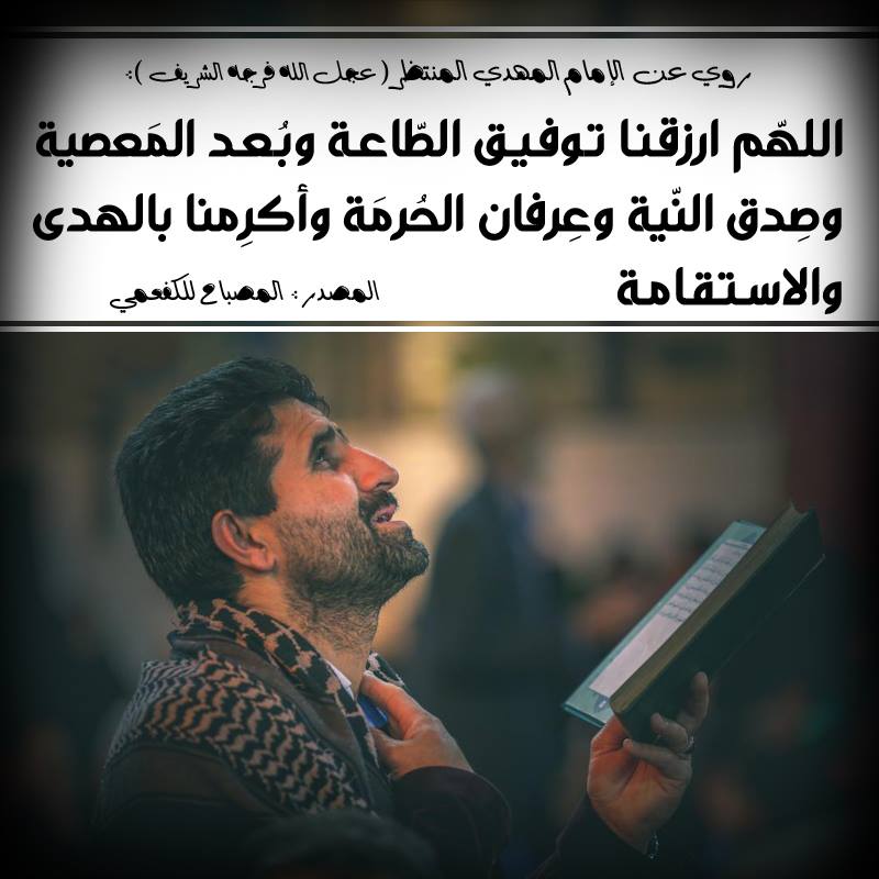 رُوِيَ عن الإمام المهدي المنتظر ( عجل الله فرجه الشريف ) أنهُ قَالَ : اللهّم ارزقنا توفيق الطّاعة وبُعد المَعصية وصِدق النّية وعِرفان الحُرمَة وأكرِمنا بالهدى والاستقامة.