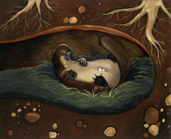 The mother, having no nipples, nurses the young with milk that comes directly from her belly skin. In about four months, the young emerge for the first time from the burrow, each about a foot long and with a full coat of fur.