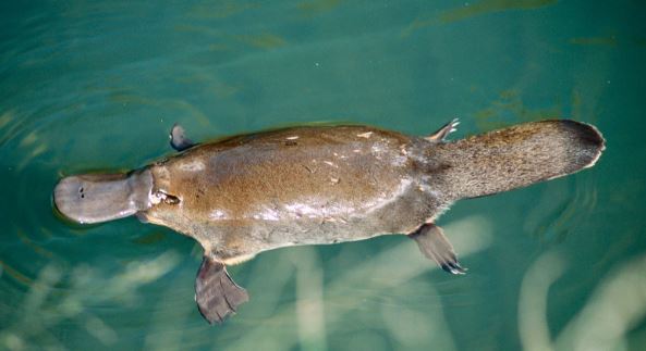 The platypus flat, beaverlike tail is used as a swimming rudder, a shovel, for fat storage, and by the mother for keeping eggs and young warm. The tail can store up to fifty percent of a platypus total load of body fat. Female platypus use the tail to carry leaves to the nesting chamber, and both sexes use it to sweep loosened soil out of the way when digging. The tail has no fine fur, only coarse, bristly hair on its upper surface to aid in carrying or sweeping.