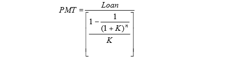 يـﻘــوم اﻟﺑﻧــك ﺑﺎﺣﺗﺳــﺎب ﻗﺳــط اﻟﻘــرض Payment – PMT)) ﻣــن ﺧــﻼل اﻹﻋﺗﻣــﺎد ﻋﻠــﻰ ﻣﻔﻬــوم اﻟﻘيـﻣــﺔ اﻟزﻣﻧيـــﺔ ﻟﻠﻧﻘــد وذﻟــك بقسمة قيمة القرض (Loan ) على معامل اﻟﻘيـﻣــﺔ اﻟﺣﺎﻟيـــﺔ ﻟﻠدﻓﻌــﺔ اﻟدوريـــﺔ ﻋﻧــد ﺳــﻌر فائدة((K وعدد فترات n)) ، ويـﻛــون اﻟﻘﺳــط اﻟﻧــﺎﺗﺞ ﻫــو اﻟﻣﺑﻠــﻎ اﻟــدوري اﻟــذي ﻋﻠــﻰ اﻟﺷــرﻛﺔ دﻓﻌــﻪ (ﺷــﻬري ، ربع سنوي ..... الخ) ﻟﺗﺳـــديـد اﻟﻣﺑﻠـــﻎ اﻟﻣﻘﺗـــرض وﻓواﺋـــدﻩ ، والمعادلة التالية ﺗوﺿـــﺢ ﻛيـﻔيــــﺔ اﺣﺗﺳـــﺎب القرض.
