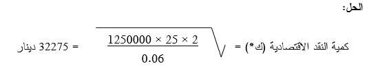 مثال 1: يبلغ الطلب الكلي على النقد لشركة طيران الجنوب 1250000دينار، وكانت تكلفة المعاملة اللازمة لتسييل الاوراق المالية لدى الشركة للحصول على النقد 25 دينار ، فاذا علمت ان الشركة تستطيع استثمار الأرصدة النقدية الموجودة لديها بعائد 6% سنوياً (تكلفة الفرصة) ،احسب كمية النقد الاقتصادية التي يجب على الشركة الاحتفاظ بها .