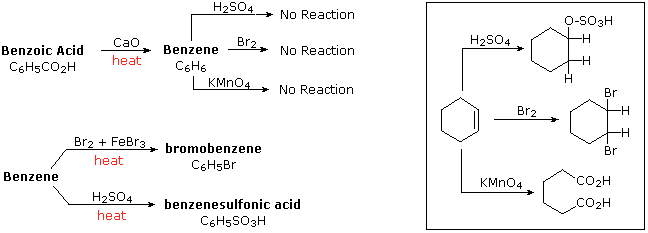 The adjective "aromatic" is used by organic chemists in a rather different way than it is normally applied. It has its origin in the observation that certain natural substances, such as cinnamon bark, wintergreen leaves, vanilla beans and anise seeds, contained fragrant compounds having common but unexpected properties. Cinnamon bark, for example, yielded a pleasant smelling compound, formula C9H8O, named cinnamaldehyde. Because of the low hydrogen to carbon ratio in this and other aromatic compounds (note that the H:C ratio in an alkane is >2), chemists expected their structural formulas would contain a large number of double or triple bonds. Since double bonds are easily cleaved by oxidative reagents such as potassium permanganate or ozone, and rapidly add bromine and chlorine, these reactions were applied to these aromatic compounds. Surprisingly, products that appeared to retain many of the double bonds were obtained, and these compounds exhibited a high degree of chemical stability compared with known alkenes and cycloalkenes (aliphatic compounds). On treatment with hot permanganate solution, cinnamaldehyde gave a stable, crystalline C7H6O2 compound, now called benzoic acid. The H:C ratio in benzoic acid is <1, again suggesting the presence of several double bonds. Benzoic acid was eventually converted to the stable hydrocarbon benzene, C6H6, which also proved unreactive to common double bond transformations, as shown below. For comparison, reactions of cyclohexene, a typical alkene, with these reagents are also shown (green box). As experimental evidence for a wide assortment of compounds was acquired, those incorporating this exceptionally stable six-carbon core came to be called "aromatic".