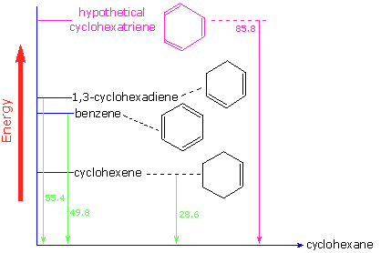 If benzene is forced to react by increasing the temperature and/or by addition of a catalyst, It undergoes substitution reactions rather than the addition reactions that are typical of alkenes. This further confirms the previous indication that the six-carbon benzene core is unusually stable to chemical modification. The conceptual contradiction presented by a high degree of unsaturation (low H:C ratio) and high chemical stability for benzene and related compounds remained an unsolved puzzle for many years. Eventually, the presently accepted structure of a regular-hexagonal, planar ring of carbons was adopted, and the exceptional thermodynamic and chemical stability of this system was attributed to resonance stabilization of a conjugated cyclictriene.