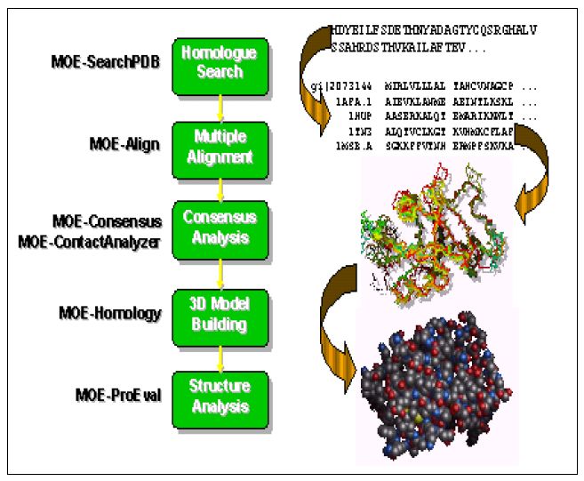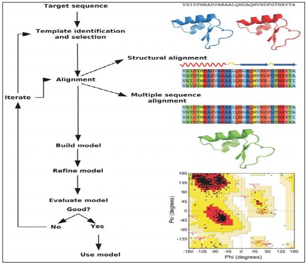 طريقة او عملية الحدس او التنبؤ بالتراكيب البروتينية على وجه الخصوص تعتمد على تماثل التواليات للتراكيب المعروفة وتعرف أيضا" بطريقة النمذجة المقارنة Comparative Modeling ، وتعتمد الطريقة على توفر المعلومات عن التراكيب الموجودة في قواعد البيانات . فبداية يتم إنشاء موديل للذرات اعتمادا" على التراكيب المحددة بالتجارب التي تكون ذو علاقة وثيقة بالتوالي . والافتراض وراء هذه الطريقة هو ان البروتينان اللذان يشتركان بنسبة عالية من تماثل التواليات فأن هناك احتمال كبير ان يكون لهما تركيب ثلاثي الأبعاد متشابه بشكل كبير ، واذا كان احدهما معروف التركيب فأن هذا سينسحب على البروتين الثاني وبدرجة عالية من الثقة ، وهناك مزودات خدمة ومواقع انترنيت تقوم بهذه المهامة نظرا لكون الحواسيب الشخصية تقصر عن هذا . والطريقة تتم بعدة خطوات للوصول الى الاستنتاج الأخير ومن هذه الخطوات الخطوة الاولى بناء نموذج أولي Crude Model لتوالي الاستعلام وذلك يصف الثمالات في تركيب القالب مع ما يقابلها في توالي الاستعلام .وبعدها يتم حساب مؤشرات الطاقة للنموذج الأولي والتي تشمل الطاقة وتداخل الثمالات والطاقة الخاصة بكراهية الماء وطاقة الذوبان Solvation Energy ، وبعدها يتم ترتيب الموديلات او النماذج اعتمادا" على مؤشرات الطاقة لإيجاد الطويات ذات الطاقة الأقل التي تعنى أفضل تلاؤم للطويات ، والمخطط التالي يوضح خطوات العمل :