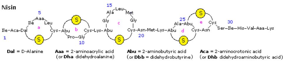 Nisin is a polypeptide (34 amino acids) made by the bacterium Lactococcus lactis. Nisin kills gram positive bacteria by binding to their membranes and targeting lipid II, an essential precursor of cell wall synthesis. Such antimicrobial peptides are a growing family of compounds which have received the name lantibiotics due to the presence of lanthionine, a nonproteinogenic amino acid with the chemical formula HO2C-CH(NH2)-CH2-S-CH2-CH(NH2)-CO2H. Lanthionine is composed of two alanine residues that are crosslinked on their β-carbon atoms by a thioether linkage (i.e. it is the monosulfide analog of the disulfide cystine). Lantibiotics are unique in that they are ribosomally synthesized as prepeptides, followed by post-translational processing of a number of amino acids (e.g. serine, threonine and cysteine) into dehydro residues and thioether crossbridges. Nisin is the only bacteriocin that is accepted as a food preservative. Several nisin subtypes that differ in amino acid composition and biological activity are known.
