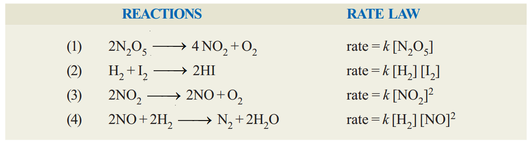 However, for some elementary reactions the powers in the rate law may correspond to coefficients in the chemical equation. But usually the powers of concentration in the rate law are different from coefficients. Thus for the reaction (4) above, the rate is found to be proportional to [H2] although thequotient of H2 in the equation is 2. For NO the rate is proportional to [NO]2 and power ‘2’ corresponds to the coefficient.