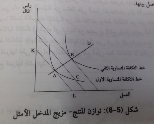 تستقصي المنشأة أي حجم معين من الناتج اذا تم ذلك بأقل تكلفة ممكنة ، ويتحقق ذلك عندما يكون منحنى الناتج المتساوي مماساً لخط التكلفة المتساوية ، في الشكل (5-6) نجد ان منحنيات الناتج المتساوية مماسة لخطوط التكلفة المتساوية في نقطتين هما A و B ، فالنقطان تمثلان نقطتي التوازن المُثلى ولكن بمستويين مختلفين من التكاليف ، أما النقطة (C) فهي تمثل المستوى نفسه من الناتج الذي يتحقق طبقاً لمنحنى الناتج المتساوي الأول ولكن بتكلفة أعلى ، حيث ينتج العمل ورأس المال المستوى نفسه من الناتج في النقطة (A) ، وهكذا فان التماس يعني التكلفة الدنيا والنقاط (D ,B ,A ) تمثل خط التوسع ( Expansion Path ) أو خط الحجم ، وهو يصل بين النقاط الثلاث ، حيث يمكن للمنشأة أن تتوسع بالانتاج على طول الخط الواصل بينها .