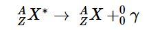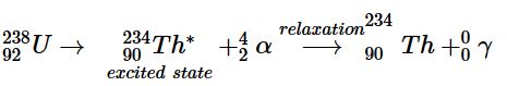 Many nuclear decay reactions produce daughter nuclei that are in a nuclear excited state, which is similar to an atom in which an electron has been excited to a higher-energy orbital to give an electronic excited state. Just as an electron in an electronic excited state emits energy in the form of a photon when it returns to the ground state, a nucleus in an excited state releases energy in the form of a photon when it returns to the ground state. These high-energy photons are γ rays. Gamma (γ) emissionA nuclear decay reaction that results when a nucleus in an excited state releases energy in the form of a high-energy photon (a γ ray) when it returns to the ground state. can occur virtually instantaneously, as it does in the alpha decay of uranium-238 to thorium-234, where the asterisk denotes an excited state: