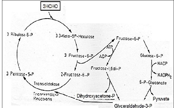 واثناء هذه الدورة يتكثف الفورمالديهايد الناتج من الكحول المثيلي مع مركب Ribulose Monophosphate ولذلك تسمى الدورة (Ribulose Monophosphate Cycle) وبعد سلسلة من التفاعلات المختلفة ( الموضحة في الشكل أعلاه) يتحول الفورمالديهايد إلى المركب Fructose – 6P الذي ينفلق معطياً البايروفات التي تحتاجها الخلايا في عمليات الأيض والبناء الأولي.