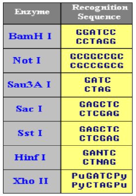 والجدول التالي يوضح مواقع التمييز لبعض الانزيمات القاطعة :