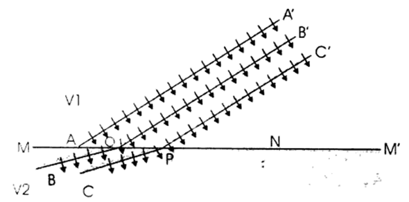 إن القسم العلوي من مقدمة الموجة (AA`) يتابع مسيرة في الوسط الأول (حيث السرعة (V1) في حين ينتقل الجزء السفلي من (AA`) إلى الوسط الثاني (حيث السرعة (V2) . وبذلك فإنه في نفس الفترة الزمنية (t) يتحرك القسم العلوي من (AA`) مسافة (v1t) في حين يكون نصف قطر الموجة الثانوية الصادرة من (A) (v2t) . فاذا كانت (v2<v1) فإن (v2t < v1t) ، وبالتالي فإن مقدمة الموجة بعد مضي الفترة الزمنية (t) هي (BoB`) وبعد فترة زمنية اخرى (t) تكون المقدمة (CPC`) . ومن الشكل يتضح ان الموجة المستوية يتغير مسارها عندما تنتقل من الوسط الاول إلى الوسط الثاني ، اي يحدث انكسار لها . وتسمى الزاوية بين مقدمة الموجة الساقطة وبين سطح الانفصال (Φ) زاوية السقوط في حين تسمى الزاوية بين مقدمة الموجة المنكسرة وبين سطر الانفصال ( `Φ) زاوية الانكسار .