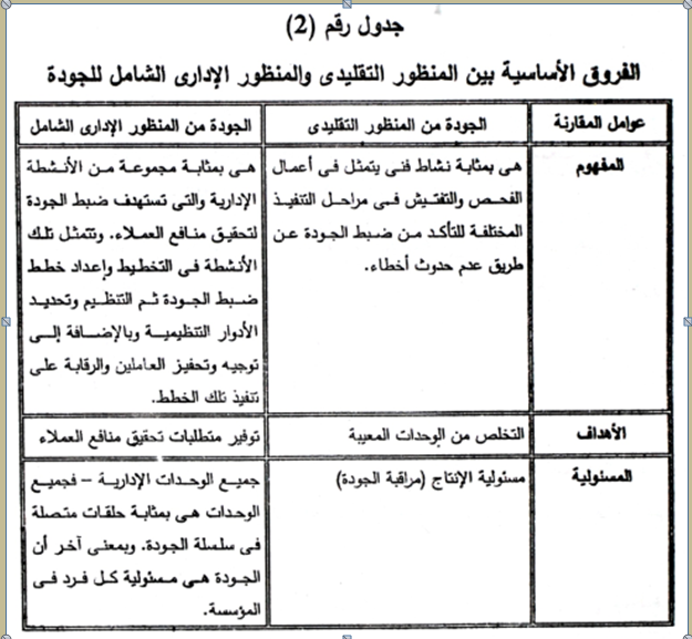 ويوضح الجدول التالي اهم الفروق بين الجودة من المنظور التقليدي والجودة من المنظور الإداري :