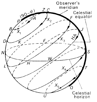 Let us suppose an observer in latitude ∅ N observes a circumpolar star of declination δ, for example star X2 in figure 1.