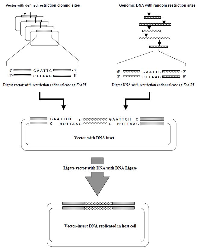 This is achieved using commercially available enzymes that cleave double-stranded DNA at specific sequences; these are known as restriction enzymes or restriction endonucleases. In Nature, restriction enzymes constitute part of the bacterial defence system by digesting double-stranded DNA from harmful bacteriophage and other foreign DNA as it enters the cell. To date, more than 3500 restriction enzymes have been identified, some of which are commercially available and used for routine molecular biology applications.If both the vector and the fragments of ‘foreign’ DNA are cut with the same restriction enzyme, such as EcoRI, which cuts at the sequence 50GAATTC30, it is a relatively straightforward procedure to join, or ligate, the two molecules because their matching ends have small overhangs with complementary base pairs (Figure ). The resulting molecule is a recombinant vector which is capable of growing in the host cell.