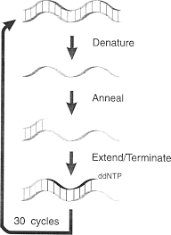 One of the most useful methods of sequencing PCR amplicons is termed PCR cycle sequencing. This is not strictly a PCR, since it involves linear amplification with a single primer. Approximately 20 cycles of denaturation, annealing and extension take place. Radiolabelled or fluorescently labelled dideoxynucleotides are then introduced in the final stages of the reaction to generate the chain-terminated extension products.