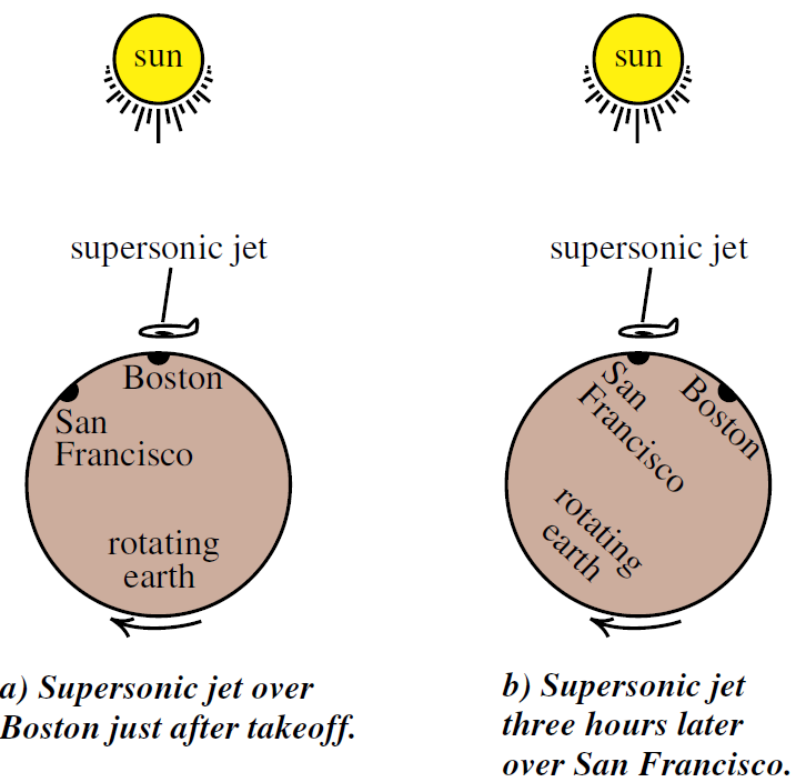 For our thought experiment, imagine that we are going to take the Concorde supersonic jet from Boston, Massachusetts to San Francisco, California. The jet has been given special permission to fly across the country at supersonic speeds so that the trip, which is scheduled to leave at noon, takes only three hours.