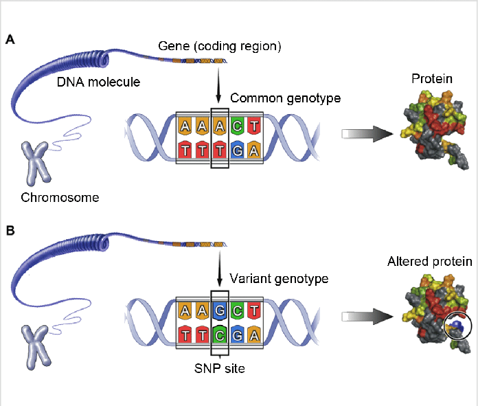 By far the most widespread type of genetic variants is the single nucleotide polymorphism. Commonly referred to as SNPs (or Snips), these variant sites are found scattered throughout the genomes of most species. An SNP is caused by a single nucleotide replacement such as GAATTC to GTATTC that occurs with a frequency of at least 1% in the population. SNP is a new name for an old phenomenon. SNPs are the cause of most RFLPs and indeed the type of mutation that was indirectly detected in isozyme analysis by zone elctrophoresis before the advent of DNA technology.45 Detailed studies of human DNA suggest that SNPs are extremely abundant: a recent estimate is that there are 10 million SNPs in the human genome,46 which gives an average of one SNP per 300 base pairs. In a recent mapping effort, more than 3 million human SNPs have been analysed in more that 200 individuals. However, SNPs are not distributed evenly throughout the genome and the frequency can vary up to 10-fold.48 Unsurprisingly, because of selection pressure, SNPs are less abundant in the coding regions than non-coding regions; other factors that affect their distribution are local recombination and mutation rates. The majority of SNPs are located in repeat regions which are difficult to analyse; even so, SNPs are the best choice of polymorphic markers that cover the whole genome. Thus it has been estimated that there are 5.3 million common SNPs, each with a frequency of 10–15%, accounting for the bulk of DNA differences. Such SNPs present themselves on average once every 600 base pairs within the human genome in non-coding DNA,50 hence the level of heterozygosity in the human genome resulting from SNPs is extraordinarily high. Many of the current the SNP detection methods can equally detect small insertions and deletions in the DNA. Although SNPs have a use for classical gene mapping by linkage analysis, they have attracted great interest as tools for large-scale association studies with the purpose of associating specific sequences and mutations with specific phenotypes. SNPs can be used simply as genetic markers to identify disease genes by linkage or association analysis, or alternatively the SNPs themselves may on rare occasions be the actual variants in DNA sequences that cause the phenotype. SNPs within genes, especially coding regions that lead to missense mutations, may well change the function, regulation or expression of a protein.52 SNPs have also been discovered in the splice sites of genes and these can result in variant protein products with different exon arrays. A number of SNPs have been discovered in the controlling region of genes and some of these are reported to affect expression and regulation of proteins. It should be emphasised thatmo st SNPs occur in non-coding sequences far away from functional genes are therefore unlikely to have any functional significance, unless by chance they were to affect the configuration of a significant motif such as a remote locus control region. SNP analysis is currently seen as the most likely approach to discovering genes and mutations that contribute to disease. The US National Center for Biotechnology Information (NCBI) curates and maintains an SNP database (dbSNP) which contains sequence details of
