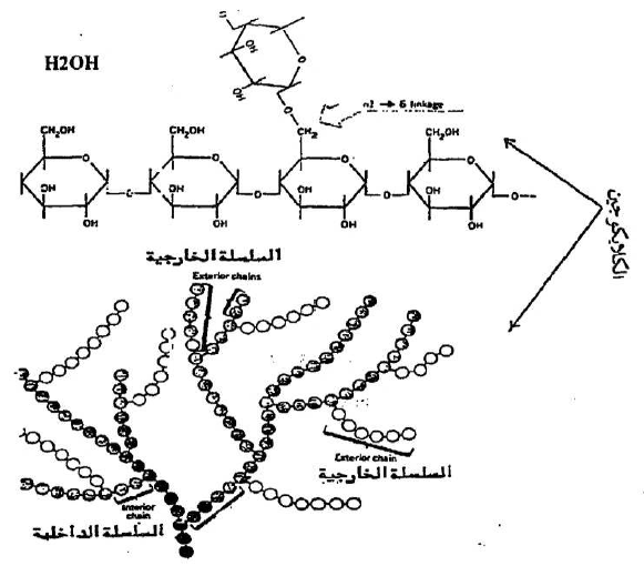 يشبه الكلايكوجين من الناحية التركيبية البنائية الاميلوبكتن حيث يكون متفرعا يحتوى على نوعين من الأواصر الكلايكوسيدية التي تربط الوحدات الكلوكوزية الأولى من النوع 1 ــ 4 . والثانية 1 ـــــــ 6 .