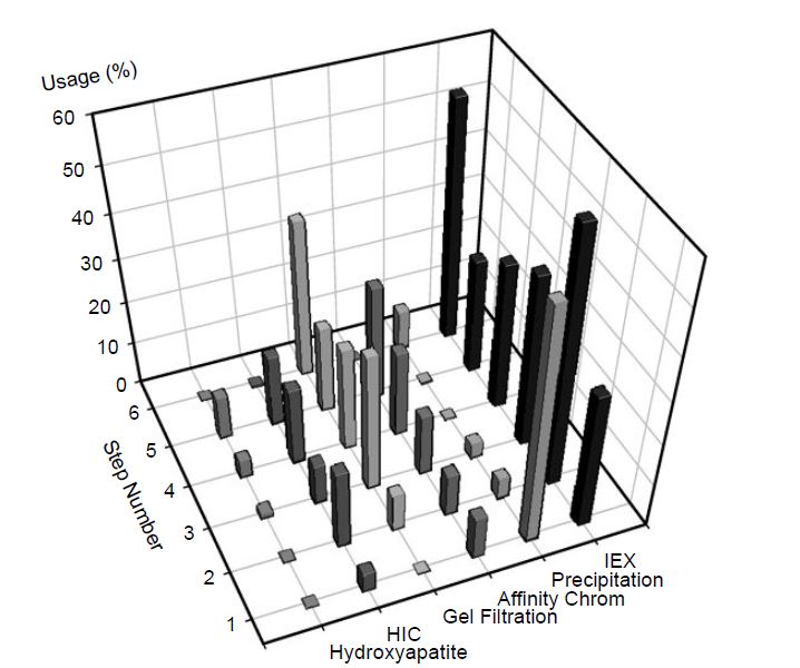Figure .2 The use of chromatography and precipitation methods as a percentage of the total number of unit operations at a given step throughout downstream processing as determined from a survey of the primary literature. IEX, ion exchange; HIC, hydrophobic interaction chromatography.