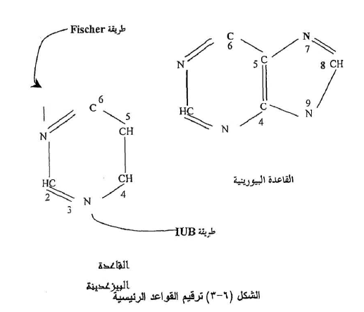 وتوجد القواعد الرئيسية المذكورة في الشكل (٦-٣) في معظم جزئيات الــ د.ن.أ DNA والـ ر.ن.أ RNA وتشكل اساساً للدراسة حيث يحتوي الــ ر.ن.A على الادينين والكوانين كقواعد بيورينية والسايتوسن واليوراسل كقواعد بيريمدينية اما في الــ د.ن.أ DNA نعوضا عن اليوراسل كقواعد بيريمدينية أما في الــ ر.ن.أ كمية صغيرة من القاعدة (5- ميثيل سايتوسن) (methyl cytosine-5) وترقم هذه القواعد حسب الرسوم المبينة في الشكل (٦-٣) بطريقتين :
