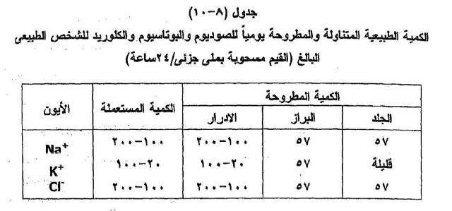 إن الكمية الطبيعية الموجودة من الــ +Na و +K والكلوريد Cl والكمية المطروحة يومياً بطرق مختلفة موضحة في الجدول (8 - 10).