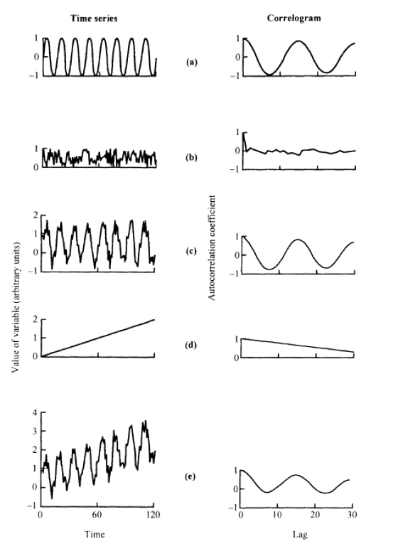 Figure 1: Time series and associated correlograms (after Davis 1986): (a) sine curve; (b) uncorrelated data (noise); (c) sine curve with superimposed noise (a+b); (d) trend; (e) sine curve with superimposed noise and trend (a+b+d).