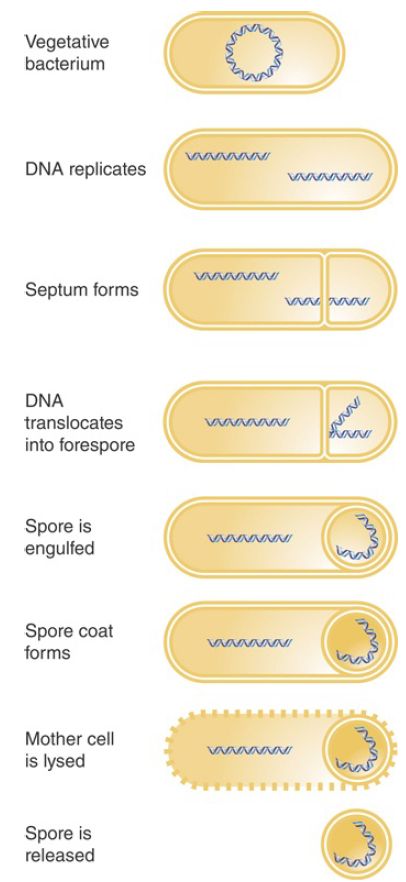 Sporulation takes approximately 8 hours. It can be viewed as a primitive sort of differentiation, in which a parent cell (the vegetative bacterium) gives rise to two different daughter cells with distinct fates: The mother cell is eventually lysed, and the spore that is released has an entirely different structure from the original bacterium.