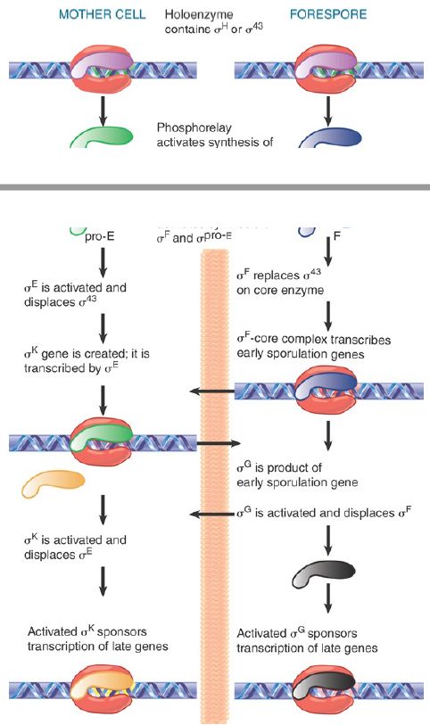 Sporulation involves a drastic change in the biosynthetic activities of the bacterium, in which many genes are involved. Changes in gene expression resulting ultimately in the formation of the spore result primarily from changes in transcription initiation. Some of the genes that function in the vegetative phase are turned off during sporulation, but most continue to be expressed. Many genes specific for sporulation are expressed only during this period, though. At the end of sporulation, about 40% of the bacterial mRNA is sporulation specific. New forms of RNA polymerase become active in sporulating cells; they contain the same core enzyme as vegetative cells, but have different proteins in place of the vegetative sigma factor, σA . The changes in transcriptional specificity are summarized in FIGURE 2. The principle is that in each compartment the existing sigma factor is successively displaced by a new sigma factor that causes transcription of a different set of genes. Communication between the compartments occurs in order to coordinate the timing of the changes in the forespore and mother cell.