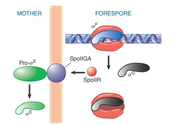 The cascade continues as products derived from promoters recognized by EσF are made in the forespore (see FIGURE 3). For example, EσF makes a transcript encoding σG , which, in turn, forms the holoenzyme that transcribes the late sporulation genes. EσF also recognizes a promoter controlling expression of a product responsible for communicating with the mother cell compartment, SpoIIR, which is secreted from the forespore into the membrane separating the two compartments. In the membrane, SpoIIR activates the membrane-bound protein SpoIIGA, which cleaves inactive precursor pro-σE into active σE in the mother cell. (σE produced in the forespore is degraded.)