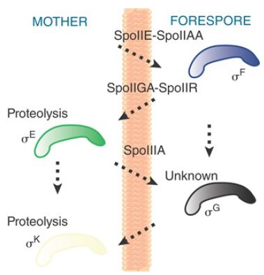 The cascade can be represented by a crisscross pattern of signals crossing the septum, connecting gene expression in one compartment with that in the other, as illustrated in FIGURE 4. As new sigma factors become active, old sigma factors are displaced, turning sets of different genes on and off in the two compartments.