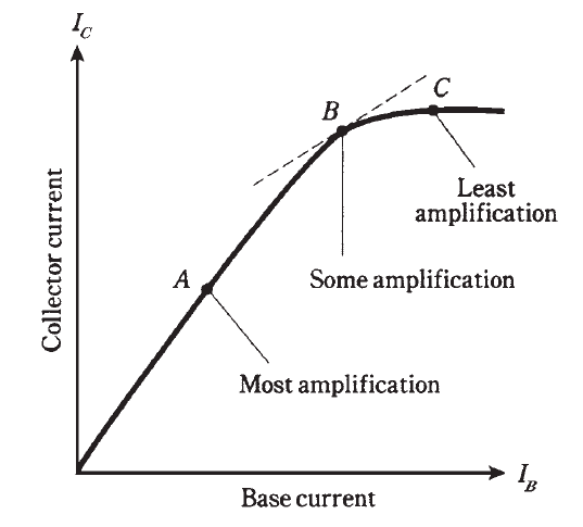 A graph of collector current versus base current (IC vs IB) for a hypothetical transistor is shown in Fig. 1. Except that current, rather than voltage, is on the horizontal scale. Three different points are shown, corresponding to various bias values.