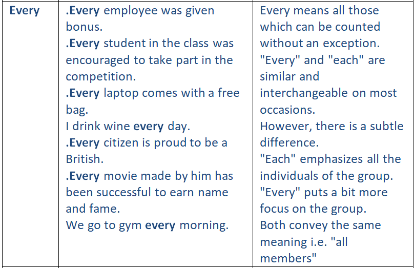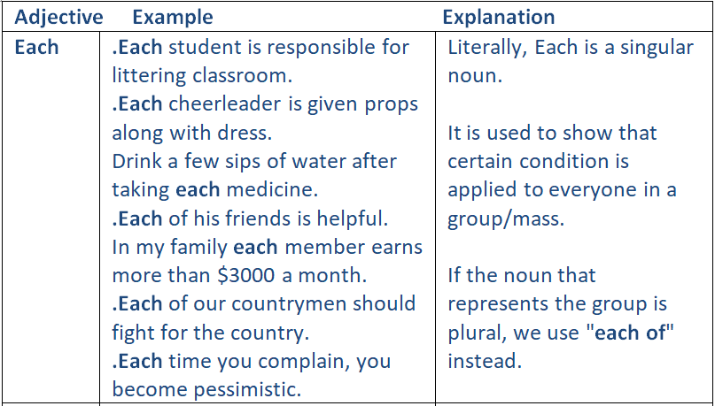 Adjectives which are used to refer people or things individually among many are called Distributive Adjectives. Distributive Adjectives are always followed by a singular noun and a verb. But, we should keep in mind that after using Distributive Adjectives we should use plural noun and singular verb.