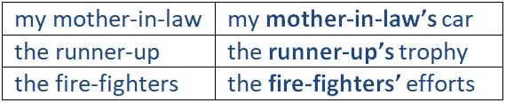 Compound nouns (see Compound nouns) put the -’s or the simple apostrophe at the end of the complete compound.