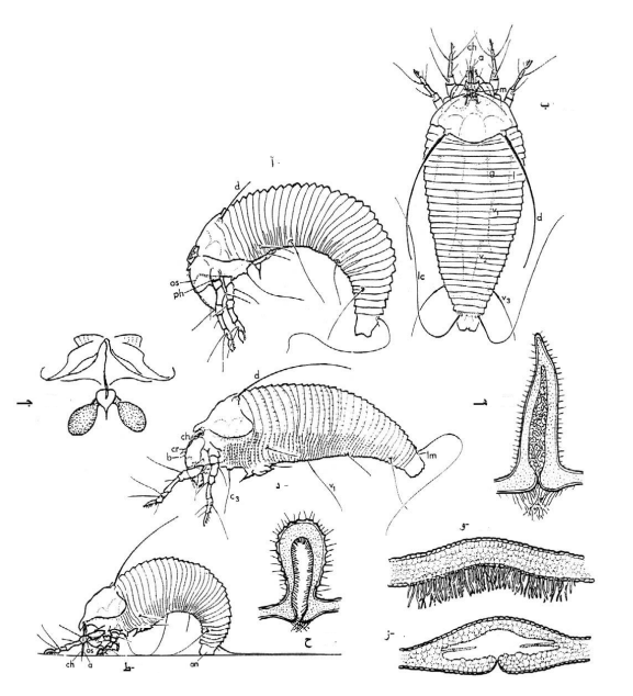 شكل يبين عائلة الحلم Sierraphytoptidae. أ, ز: خازنة الحيامن المنوية والتراكيب المرتبطة بها، ب : لوحة مقدم الظهر، ج : الرجل الأولى، د: الوسادة ، هـ: منظر جانبي لأنثى الحلم Phytoptus avellanae Nalepa مع الدرينات (عن Krantz ، 1978).