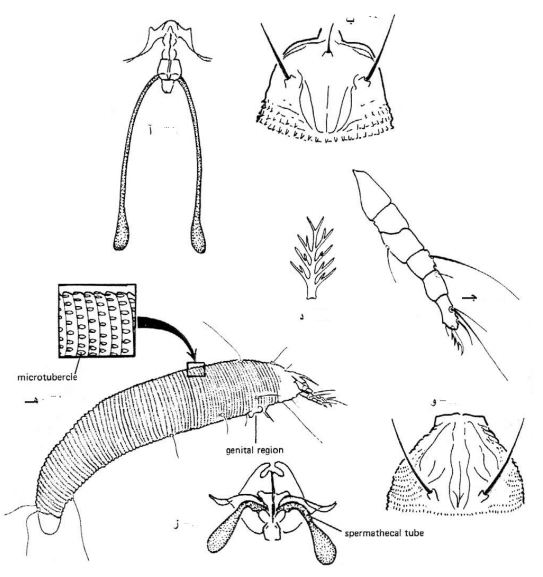 - السوءة لا تبرز عن سطح بطن الجسم الأمامي، مضغوطة على الحراقف، الحراقف ليست متباعدة أكثر من المعتاد ، خط اللوحة البطنية غالبا معتدل الطول ، يمتد الهيكل الداخلي الأمامي في الأنثى باعتدال إلى الأمام ، الحرقفات غالبا منقوشة بحبيبات ، لكن الخطوط المنحنية في حالة وجودها خفيفة ، غطاء السوءة في الأنثى مرقط غالبا ، الضلوع بصفين وليس غالبا ، الشعرات الظهرية موجودة ويندر أن تكون مفقودة ........4