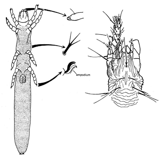 شكل يبين عائلة Nematalycidae. يلاحظ أن جسم أفراد هذه العائلة أصبح متطاولا ودوديا، وانسحاب الأرجل الخلفية بعيدا عن الأرجل الأمامية (عن Krantz ، 1978)
