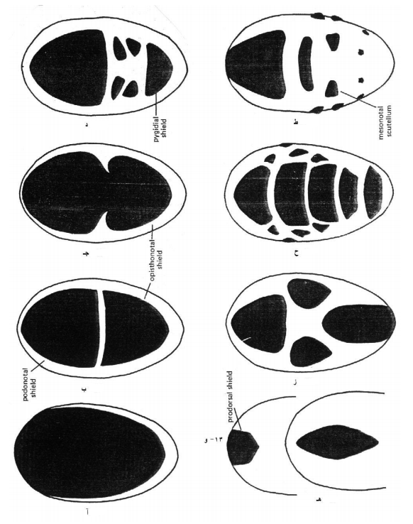 الشكل (5) الألواح أو الصفائح الظهرية في الأكاروسات. أ ، ب ، ج، د، هـ الألواح الظهرية في مجموعة Gamasida ، ب ، ز ، ح الألواح الظهرية في مجموعة Actimedida ، و اللوحة الظهرية في Acaridida ، ط الألواح الظهرية في الحلم الخنفسي Oribatida. (عن Krantz ، 1978)