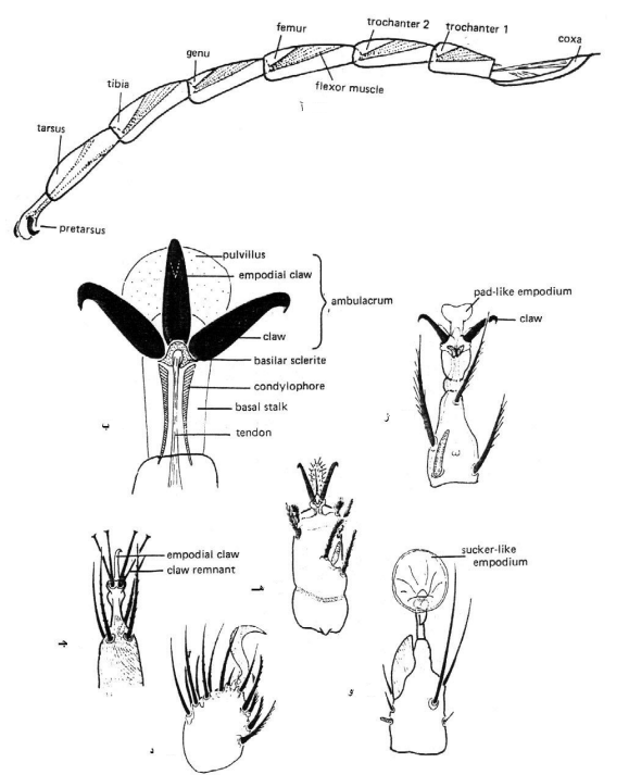 الشكل (7) تركيب الأرجل والرسغ في الأكاروسات. أ: تركيب وعقل الرجل في الأكاروسات مع العضلات، ب: مقدم رسغ نموذجی، ج: رسغ الرجل الثالثة في حلم Oligonychus sp، د: رسغ الرجل الثانية في Oribatida ،هـ: رسغ الرجل الثانية في حلم Ereynetidae، و: رسغ الرجل الثانية في Heterocheylus sp ،ز: الرسغ الثاني في Pygmephorus sp. (عن Krantz ، 1978)