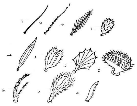 الشكل (13): أشكال الشعيرات الحسية. أ: شعرة بسيطة، ب: شعرة متفرعة ، ج : شعرة ريشية، د: شعرة رأسية ، هـ : ورقية ، و : قلبية ، ز : راحية ، ح : حجرية ، ط : شوكية ، ي : صولجانية ، ك: مسننة. (عن محمد ، 1963)