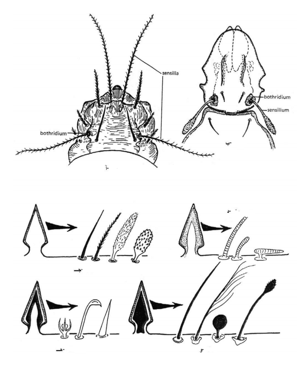 إضافة لما سبق فان الشعيرات الحسية قد تتخذ أشكال كثيرة منها: بسيطة Simple (الشكل 13-أ)، شعري متفرع Pilose (الشكل 13-ب)، ريشي Plumose (الشكل 13-ج)، رأسية Capitate (الشكل 13-د)، ورقية Spatulate (الشكل 13-هـ)، قلبية Chordate (الشكل 13-و)، راحية Palmate (الشكل 13-ز)، حجرية Chambered (الشكل 13-ح)، شوكية Furcat (الشكل 13-ط)، صولجانية Clubed (الشكل 13-ي)، مسننة Dentate (الشكل 13-ك).